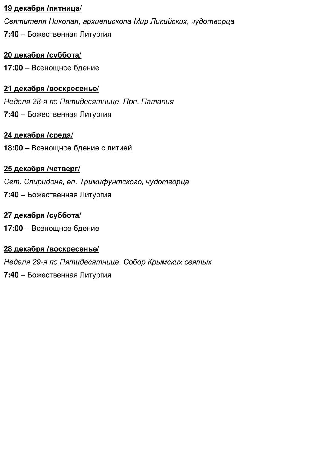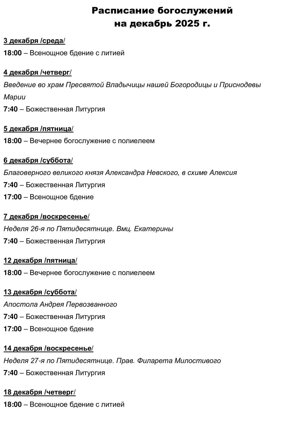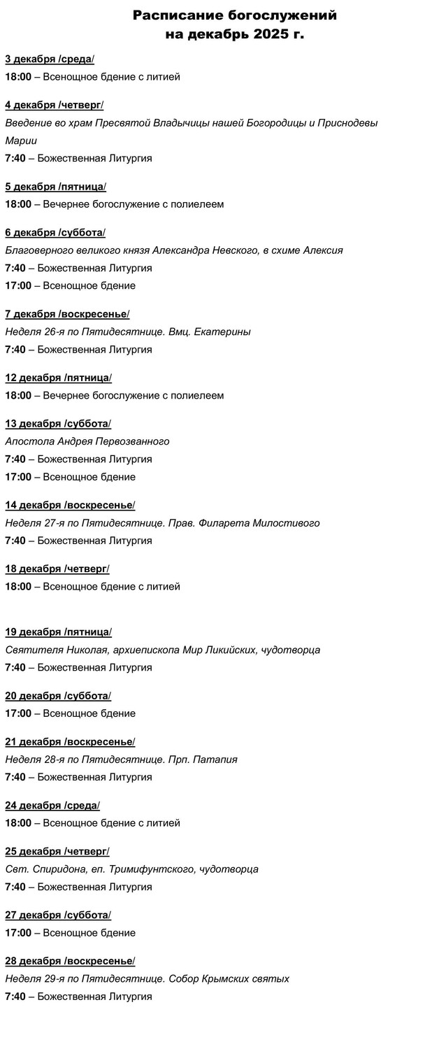РАСПИСАНИЕ БОГОСЛУЖЕНИЙ
